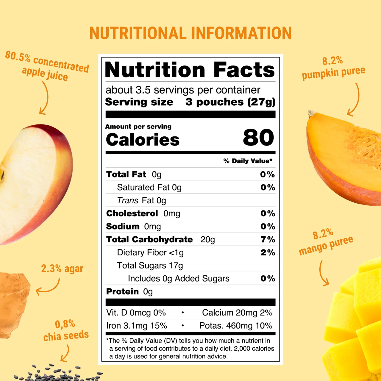 Concentrated apple juice 80.5%, mango puree 8.2%, pumpkin puree 8.2%, thickening agent: agar 2.3%, chia seeds 0.8%