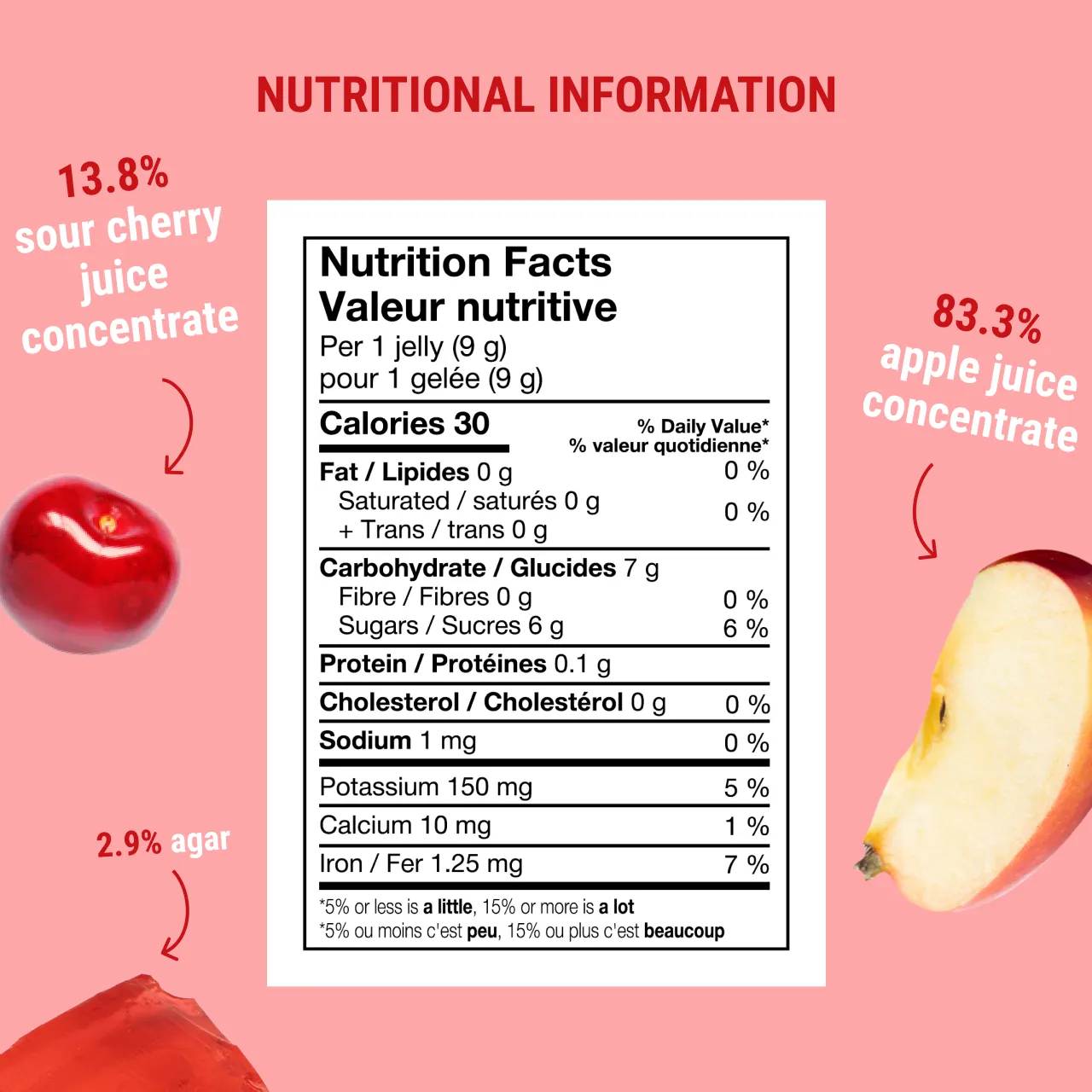 Concentrated apple juice 83.3 %, concentrated cherry juice 13.8 %, thickening agent: agar 2.9 %.