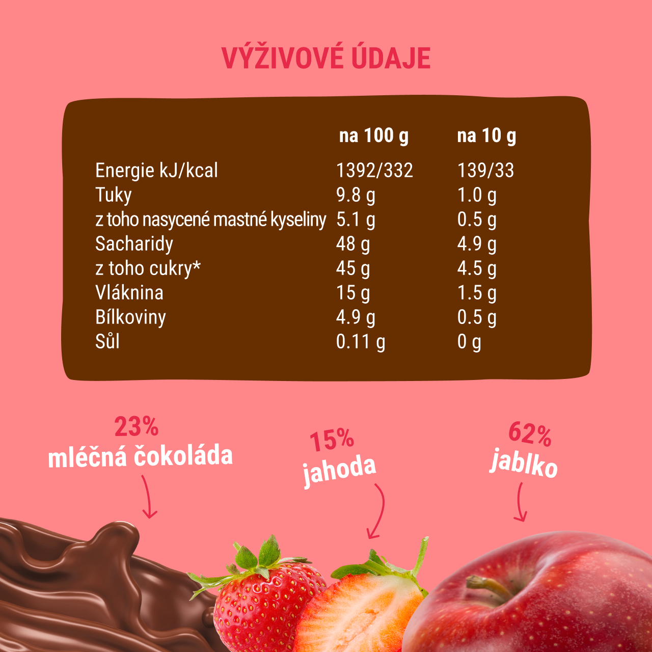 Ovocná náplň (77 %), (jablko 61,6 %, jahody 15,4 %) mléčná čokoláda (23%)