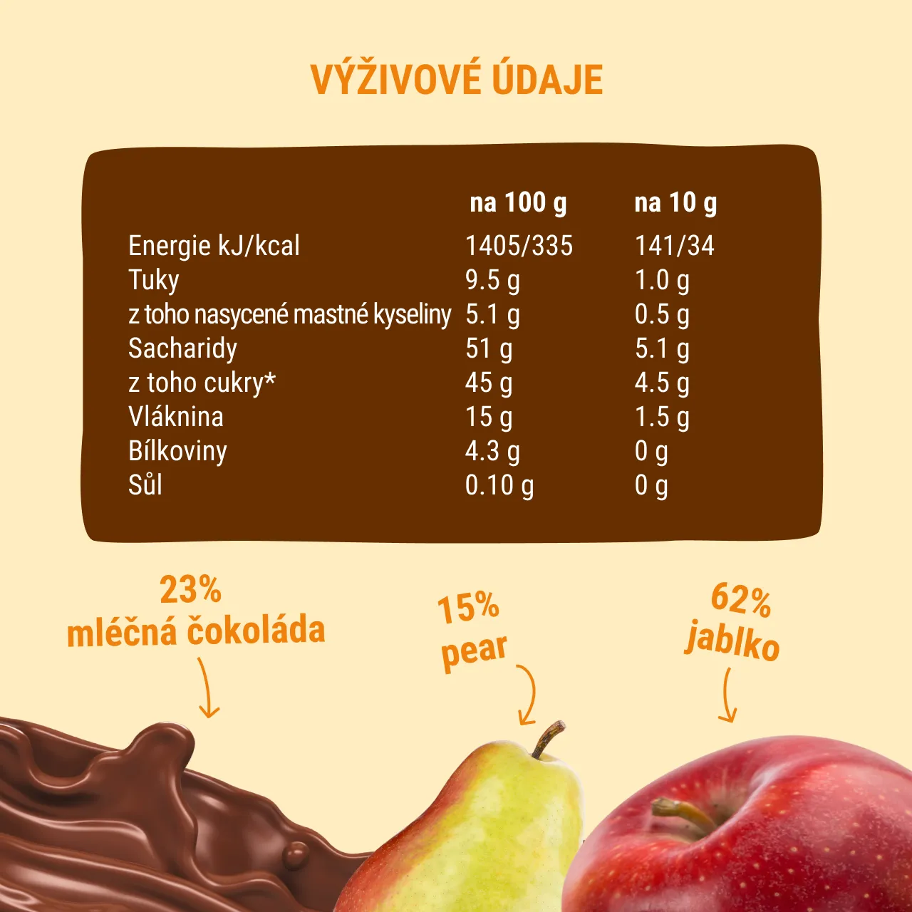 Ovocná náplň (77 %), (jablko 65 %, hruška 12 %), mléčná čokoláda (23%)