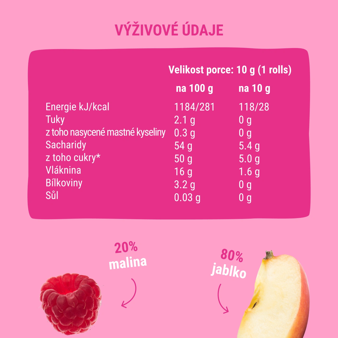 Ovocné rolky jsou přírodní a zdravou volbou, vyrobenou ze skutečného ovoce, bez přidaného cukru, konzervantů, umělých barviv a aromat. Chutnají dětem i dospělým, představují zdravou alternativu svačiny, ať už na cestách, ve škole nebo v práci.
