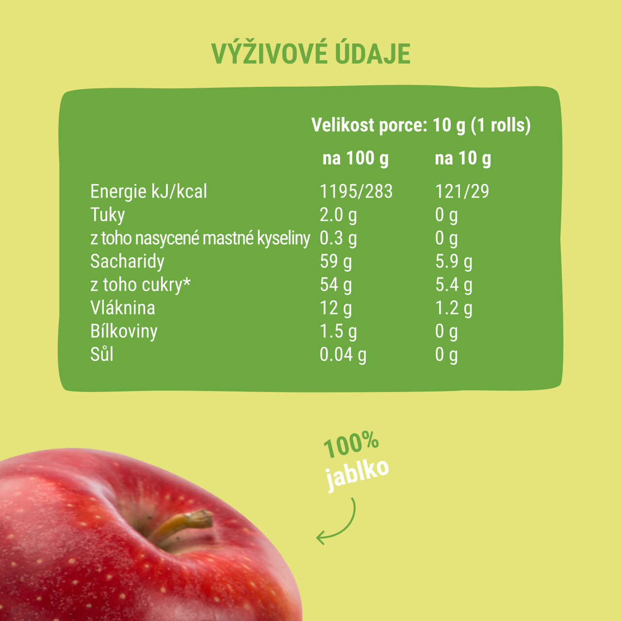 Ovocné rolky jsou přírodní a zdravou volbou, vyrobenou ze skutečného ovoce, bez přidaného cukru, konzervantů, umělých barviv a aromat. Chutnají dětem i dospělým, představují zdravou alternativu svačiny, ať už na cestách, ve škole nebo v práci.