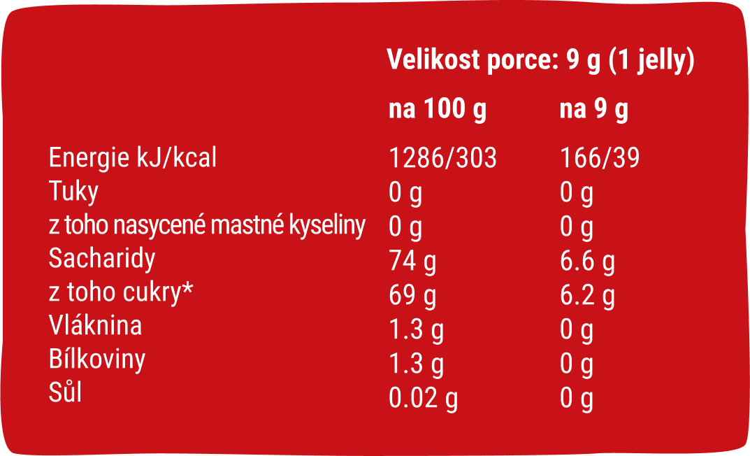 Jablečná šťáva z koncentrátu 83.3%, Třešňová šťáva z koncentrátu 13.8%, Želírující látka 2.9%.