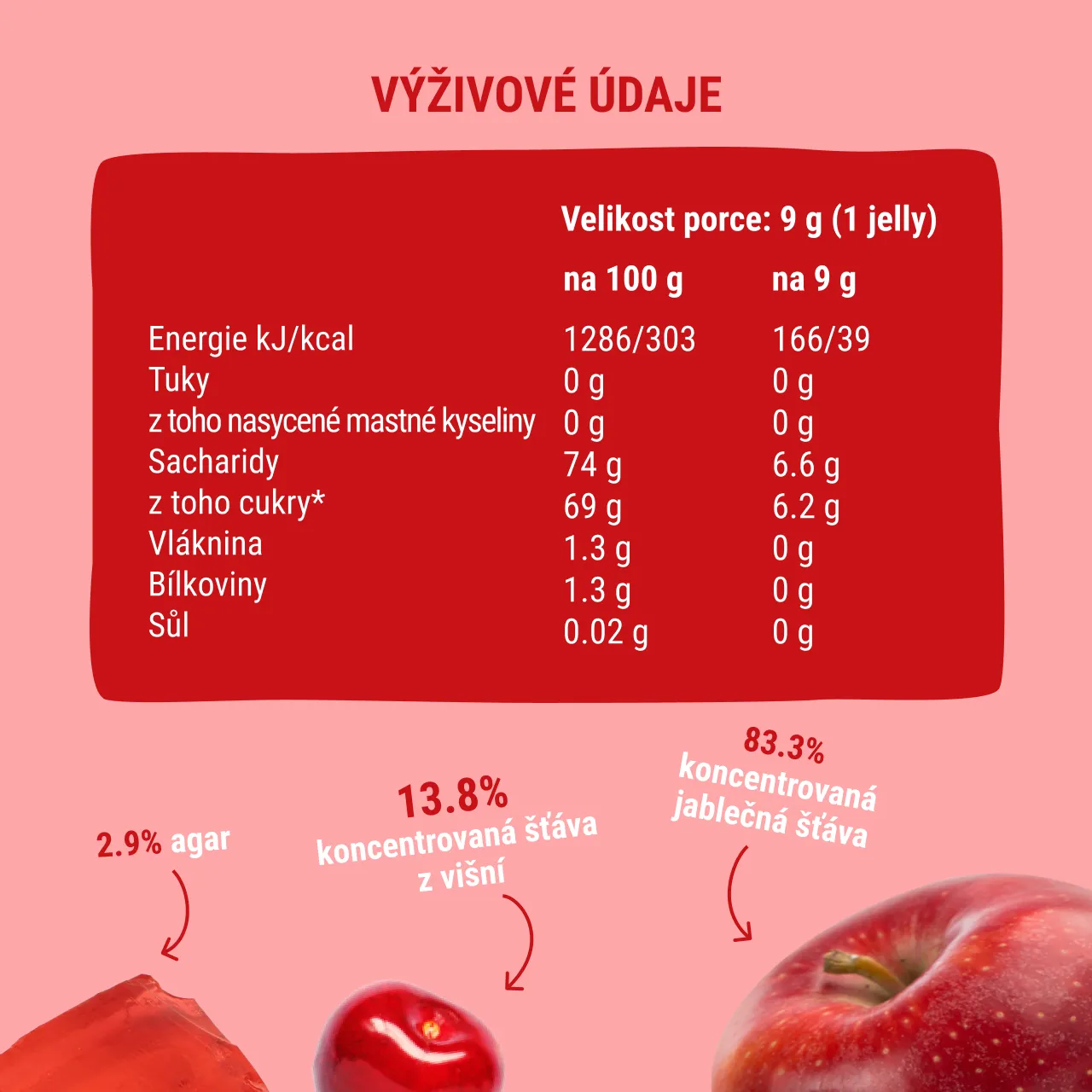 Jablečná šťáva z koncentrátu 83.3%, Třešňová šťáva z koncentrátu 13.8%, Želírující látka 2.9%.