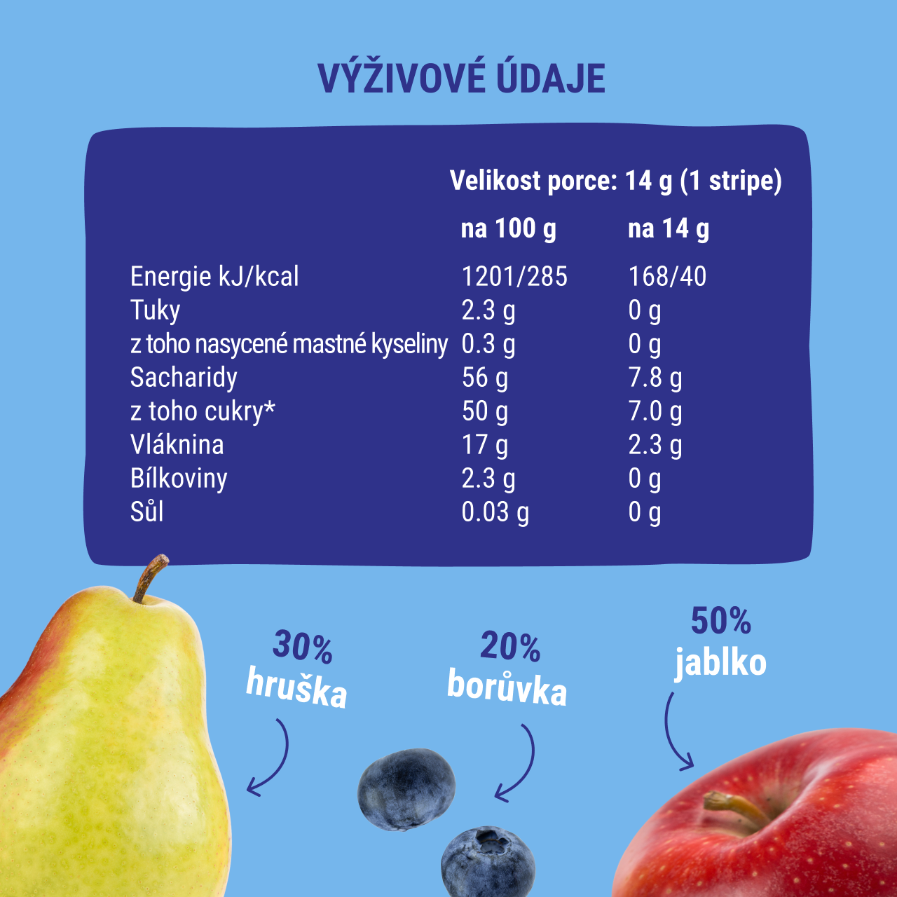 Složení ovocných plátků je jednoduché, zdravé a zcela transparentní. 100% přírodní, veganské a perfektně se hodí do školy i na venkovní aktivity.