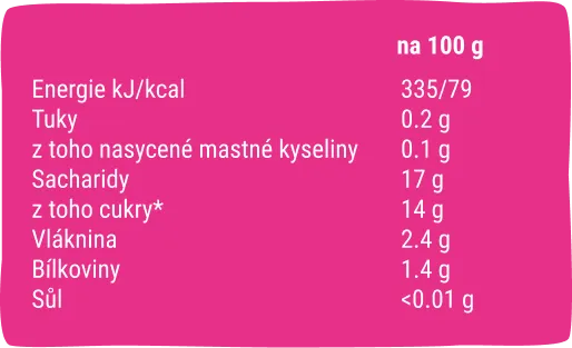 Moje produkty jsou vyrobené 100% pouze z ovoce, bez přidaného cukru. Neobsahují nejběžnější alergeny: arašídy, ořechy, mléko, vejce, sóju, obiloviny obsahující lepek, ryby, měkkýše, nebo sezam. Neobsahují lepek ani umělé přísady. Pouze čisté ovoce a nic víc!
