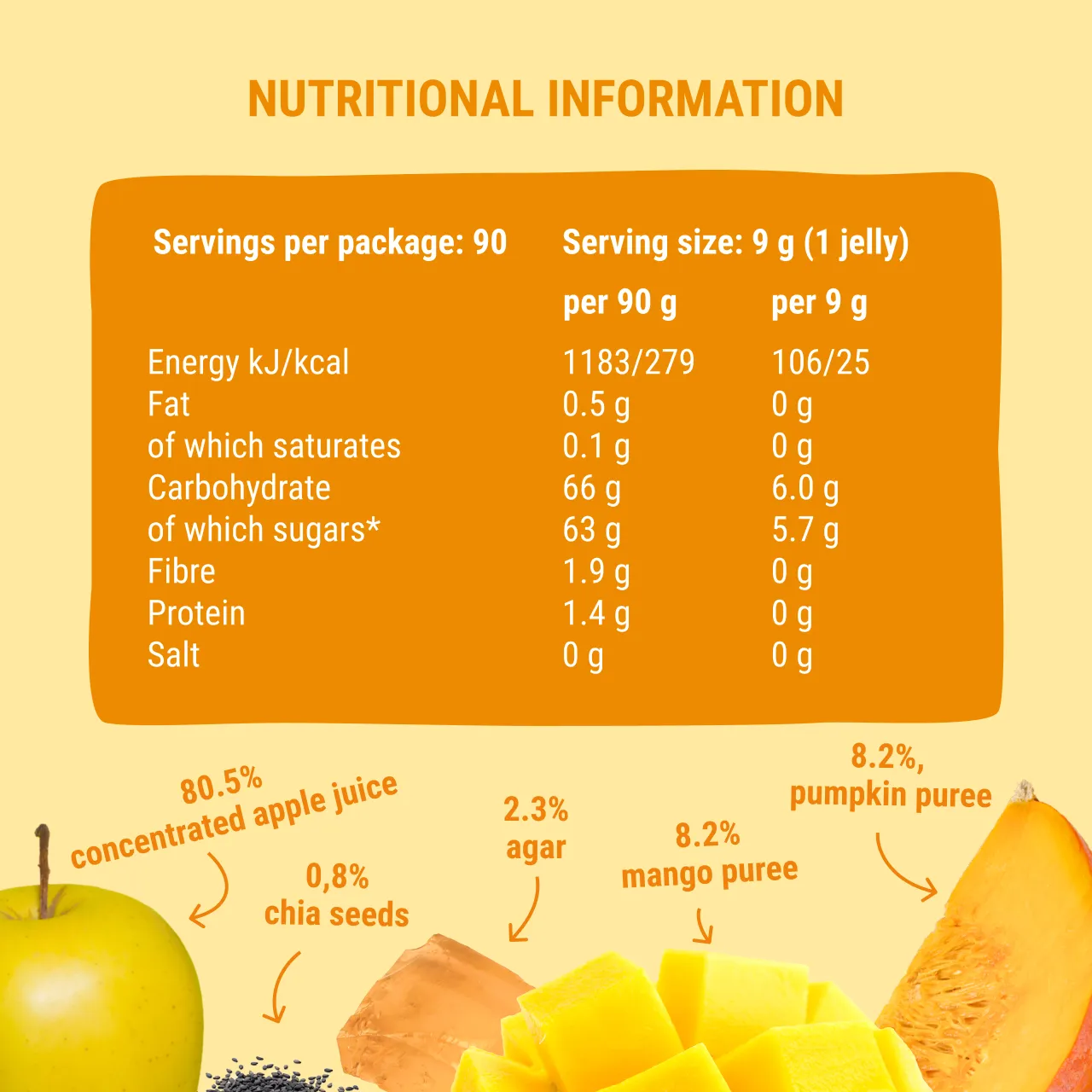 Concentrated apple juice 80.5%, mango puree 8.2%, pumpkin puree 8.2%, thickening agent: agar 2.3%, chia seeds 0.8%.