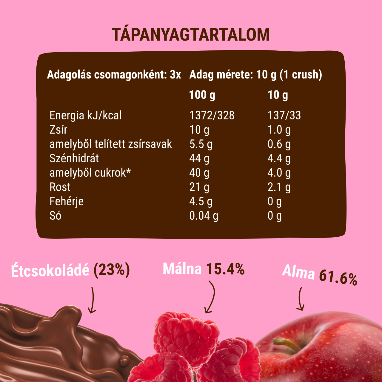 Gyümölcstöltelék (77%): alma 61.6%, málna 15.4%; étcsokoládé (23%): kakaómassza, rost (oligofruktóz), zsírszegény kakaópor, TEJZSÍR, emulgeálószer: napraforgó lecitin, természetes vanília aroma, édesítőszer: stevia kivonat. *Kakaó szárazanyag tartalom az étcsokoládéban minimum 70%. Az allergén összetevők aláhúzva.