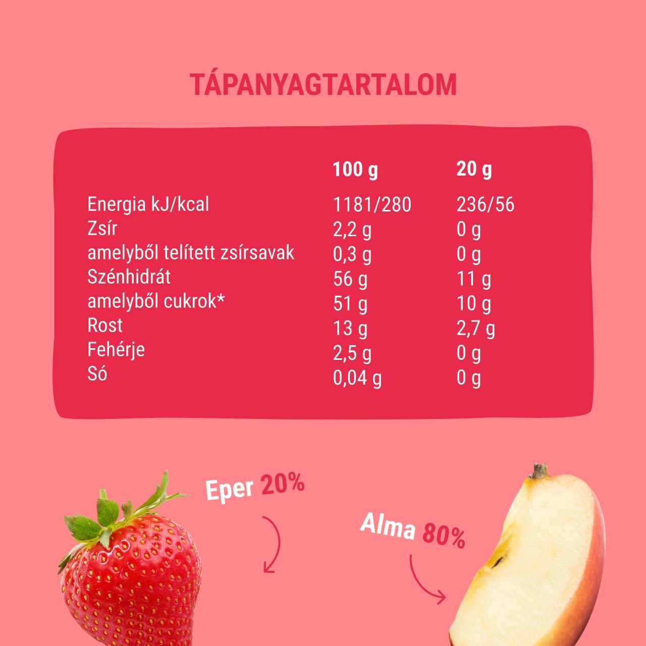Csak gyümölcsből készült, hozzáadott cukor és mesterséges adalékok nélkül. Allergénmentes, vidám gyümölcs- és kis csigaformákkal – tökéletes nassolnivaló minden korosztálynak, bárhol.
