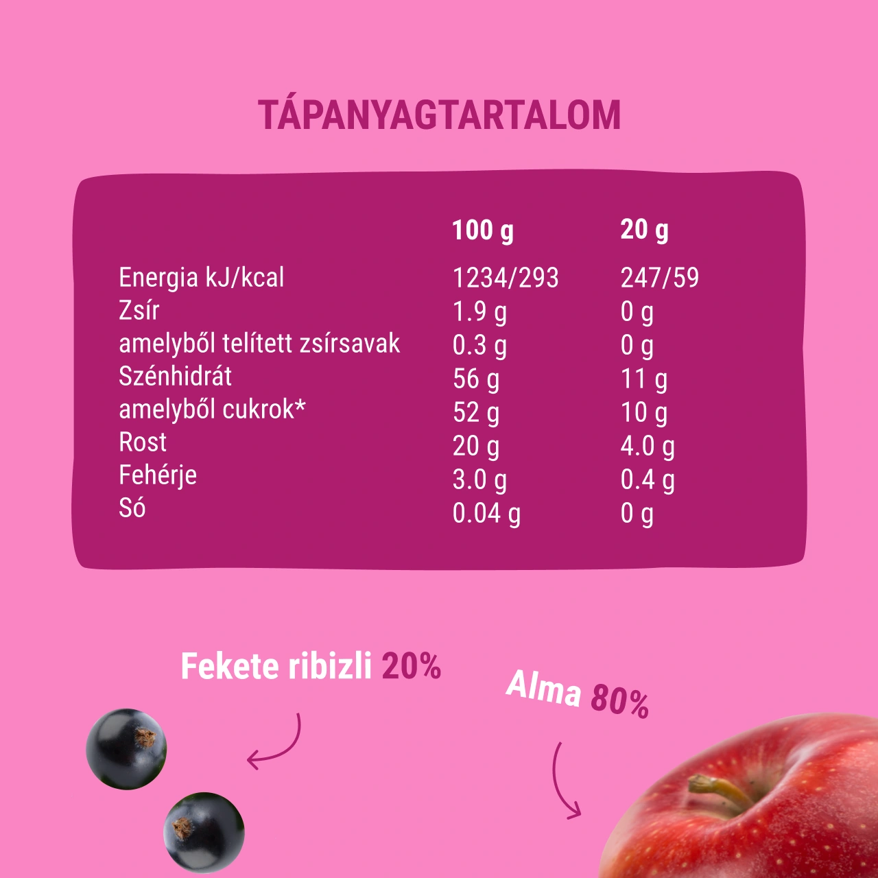 Alma 80%, feketeribizli 20%.