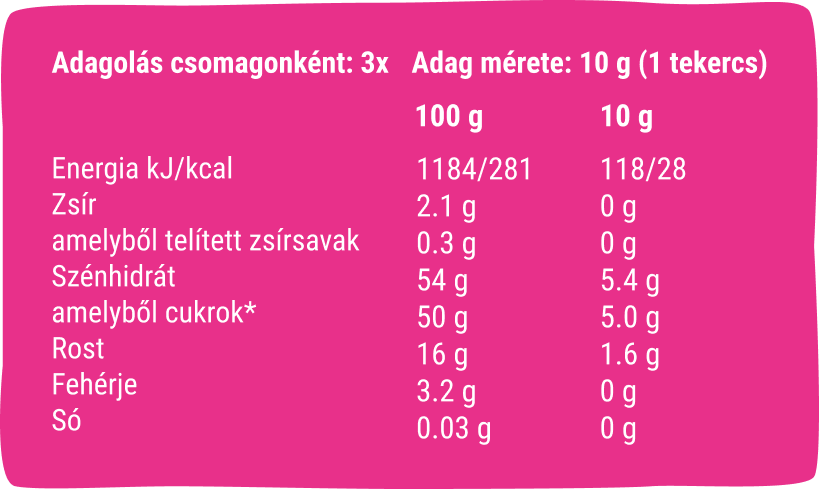 | Könnyen magaddal viheted – pont beleillik az uzsonnásdobozba, sporttáskába, kocsiba vagy hátizsákba. És a fogyasztásuk igazi móka! Tépj belőle, harapj bele, vagy tekerd ki lassan, hogy tovább tartson a gyümölcsös élvezet! |
