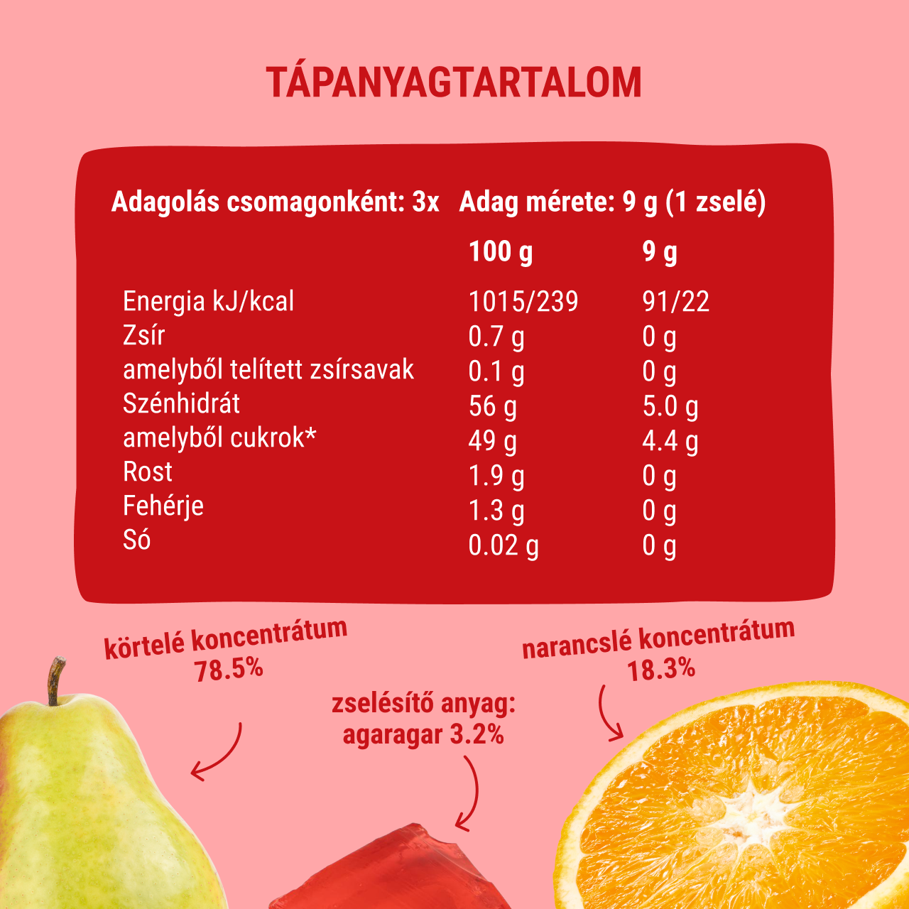 Természetes, sűrített gyümölcsléből készült gumicukor – nincs benne hozzáadott cukor, zselatin, glutén. Agaragarral sűrítve – 100%-ban vegán, egészségesebb alternatíva hagyományos édességeknek.