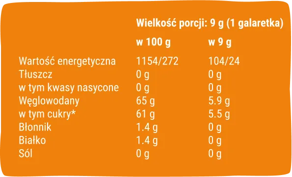 Koncentrat soku z Jabłek 78,2%, Koncentrat soku z gruszki 18,4%, Koncentrat soku z cytryny 0,5%, agar 2,9%.