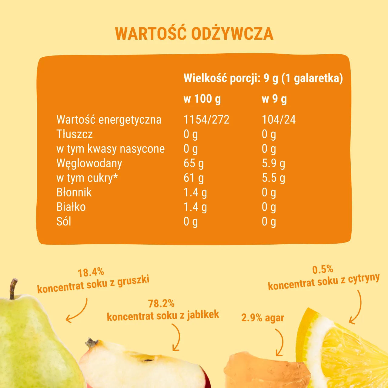 Koncentrat soku z Jabłek 78,2%, Koncentrat soku z gruszki 18,4%, Koncentrat soku z cytryny 0,5%, agar 2,9%.