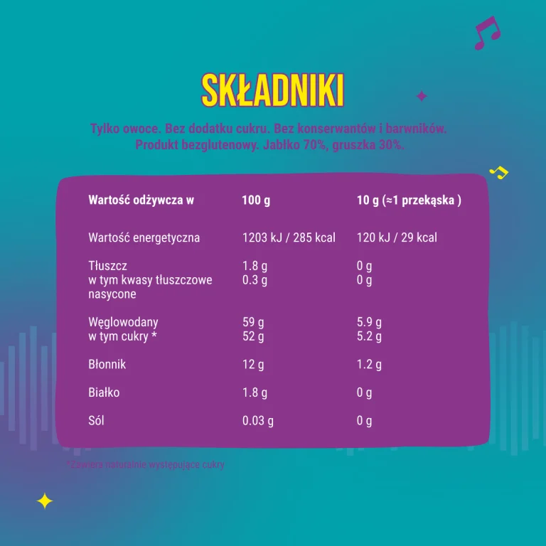 Moje przekaski są wykonane w 100% z owoców bez dodatku cukru. Nie zawierają powszechnych alergenów: orzechów, mleka, jaj, soi, pszenicy, ryb, skorupiaków ani sezamu. Bez glutenu i sztucznych składników. Tylko czyste owoce i nic więcej!