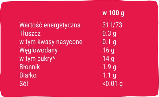 Moje przekaski są wykonane w 100% z owoców bez dodatku cukru. Nie zawierają powszechnych alergenów: orzechów, mleka, jaj, soi, pszenicy, ryb, skorupiaków ani sezamu. Bez glutenu i sztucznych składników. Tylko czyste owoce i nic więcej!