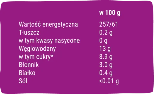 Moje przekaski są wykonane w 100% z owoców bez dodatku cukru. Nie zawierają powszechnych alergenów: orzechów, mleka, jaj, soi, pszenicy, ryb, skorupiaków ani sezamu. Bez glutenu i sztucznych składników. Tylko czyste owoce i nic więcej!