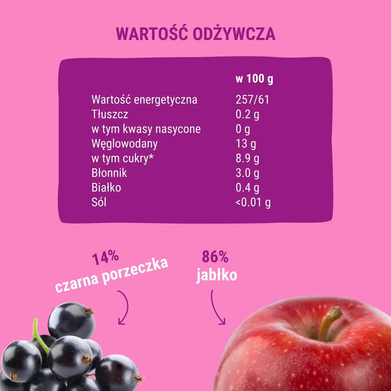 Przecier jabłkowy 86%, przecier z czarnej porzeczki 14%.