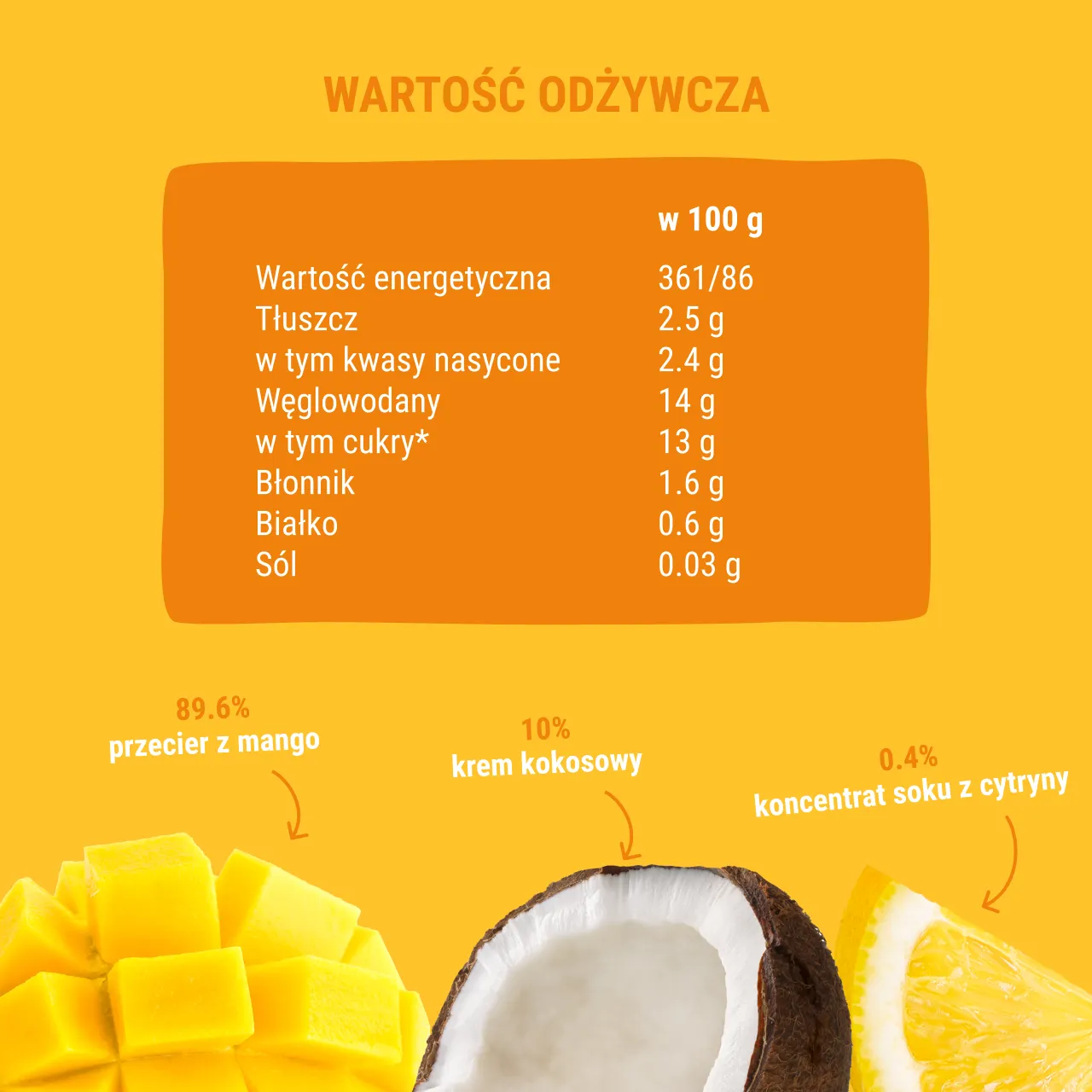 Przecier z mango 89.6%, krem kokosowy 10%, sok cytrynowy z koncentratu 0.4%.