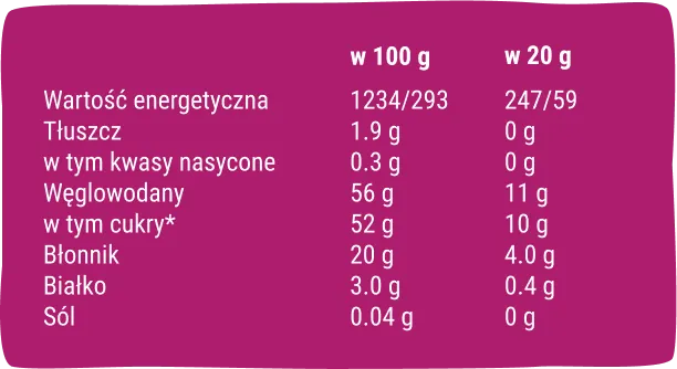 Moje przekaski są wykonane w 100% z owoców bez dodatku cukru. Nie zawierają powszechnych alergenów: orzechów, mleka, jaj, soi, pszenicy, ryb, skorupiaków ani sezamu. Bez glutenu i sztucznych składników. Tylko czyste owoce i nic więcej!